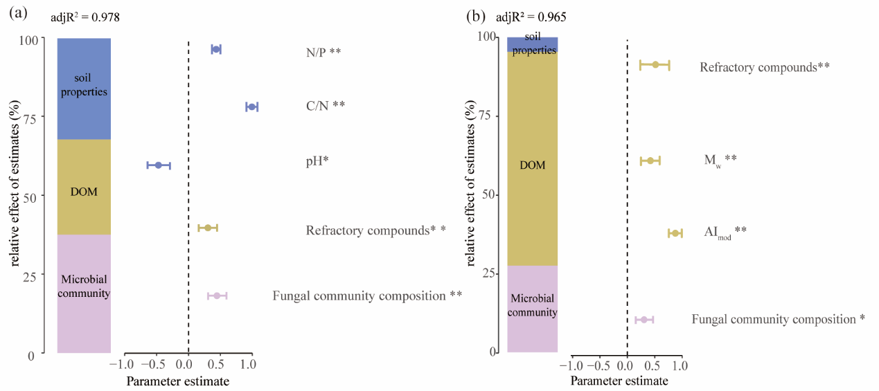 图2 多元线性回归结合层次分割法解释土壤理化性质、微生物群落及DOM对表土(a)和底土(b)中MNC积累的相对贡献